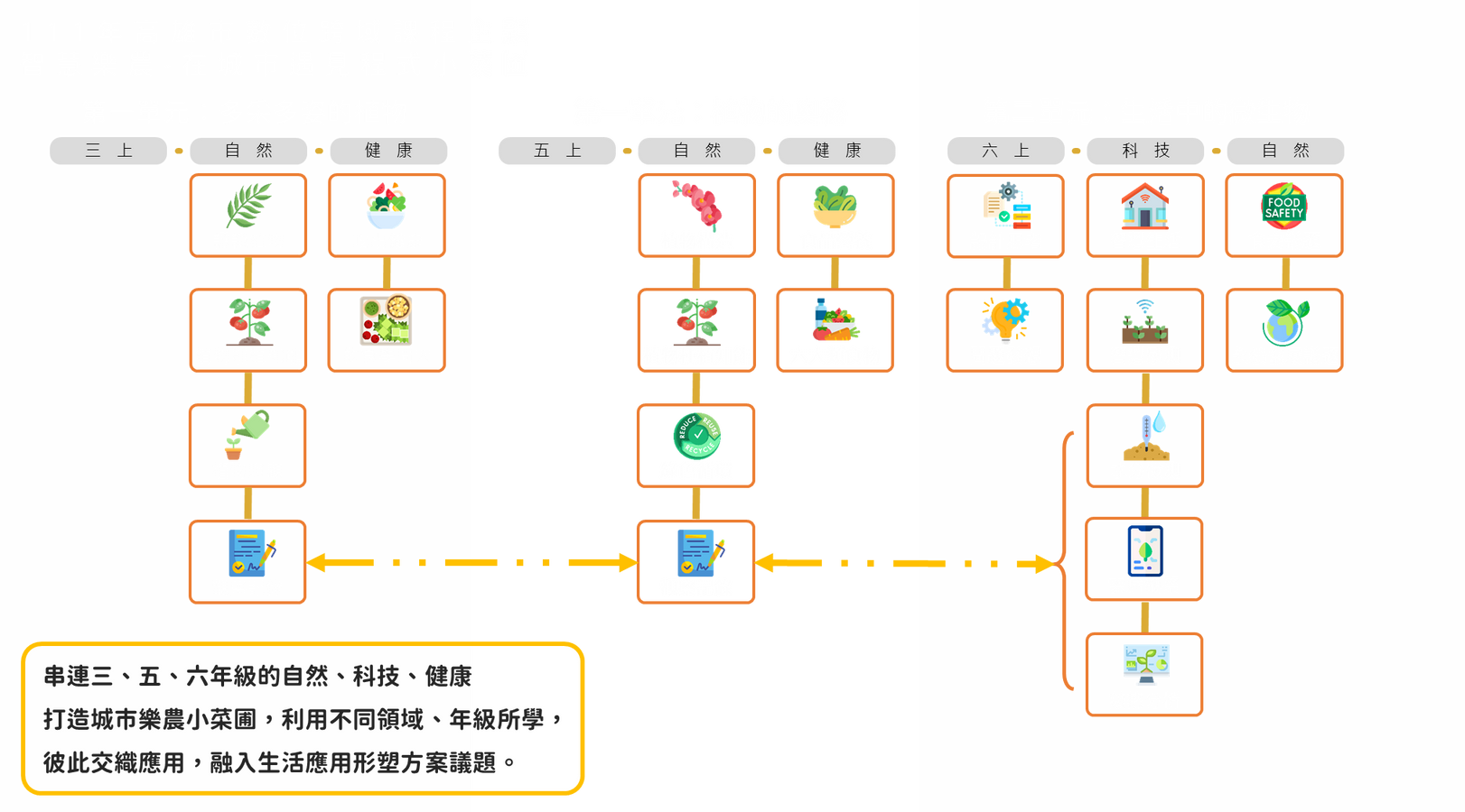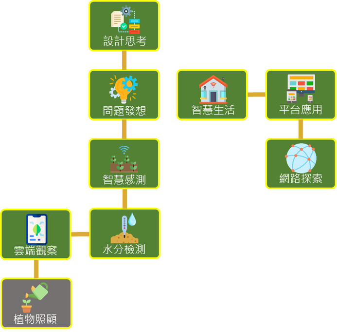 在本校校訂科技課程中,六年級以智慧生活為主,發展出智慧家居、智慧語音及智慧辨識等系列課程,本年度配合自然領域,結合小朋友喜歡的植物議題,發展出智慧農業系列課程,讓傳統繁瑣的自然觀察、澆灌作業使用科技工具,自動感測土壤中的含水量、酸鹼值,以及植物光照程度,發想自動化的解決議題,並且配合課程向下紮根,以六年級學生帶領三、四年級學生,大手牽小手,一同創意發想,改善自然領域既有的植物系列課程。